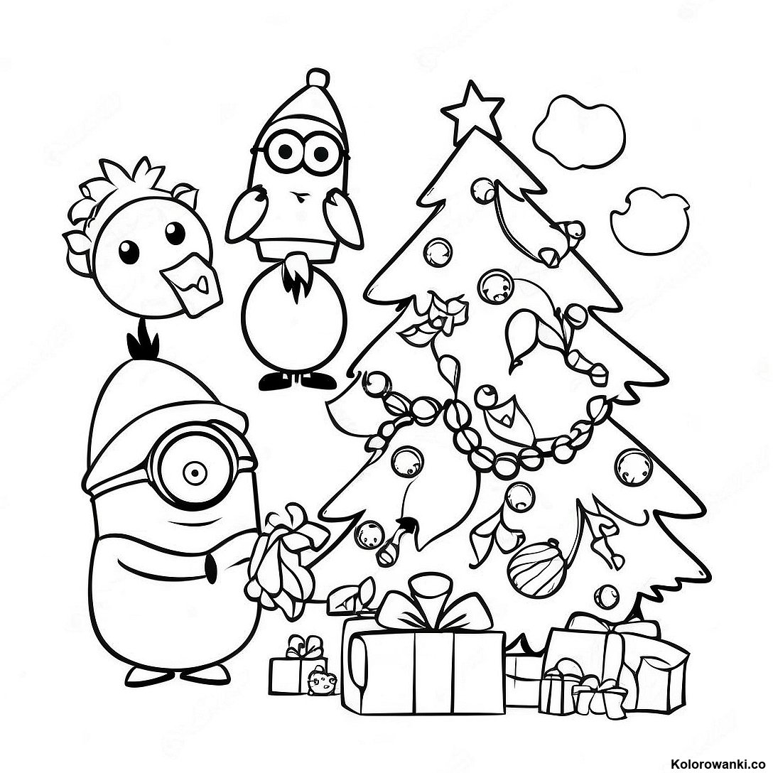 Pobierz Drukowalny PDF Kolorowanka Minionków Dekorujących Choinkę