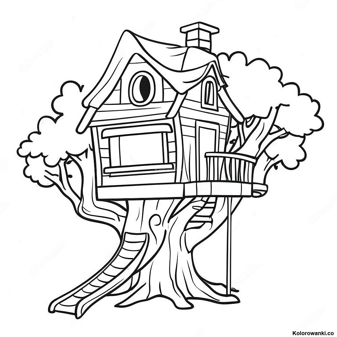 Pobierz Drukowalny PDF Kolorowy Domek Na Drzewie Ze Zjeżdżalnią Kolorowanka