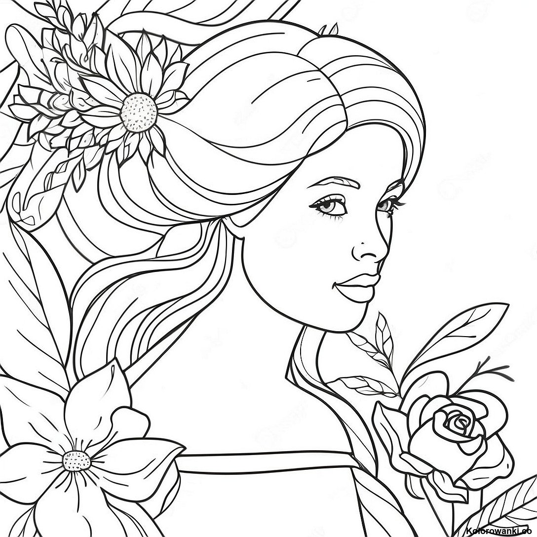 Piękna Kobieta Z Kwiatami - Kolorowanka