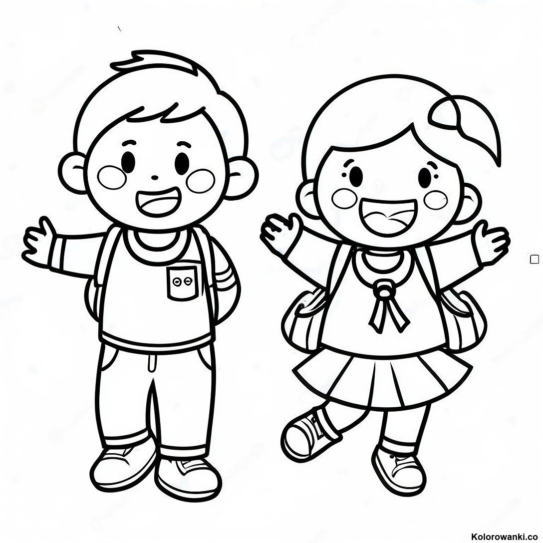 Pobierz Drukowalny PDF Podekscytowane Dzieci W Pierwszy Dzień Szkoły - Kolorowanka
