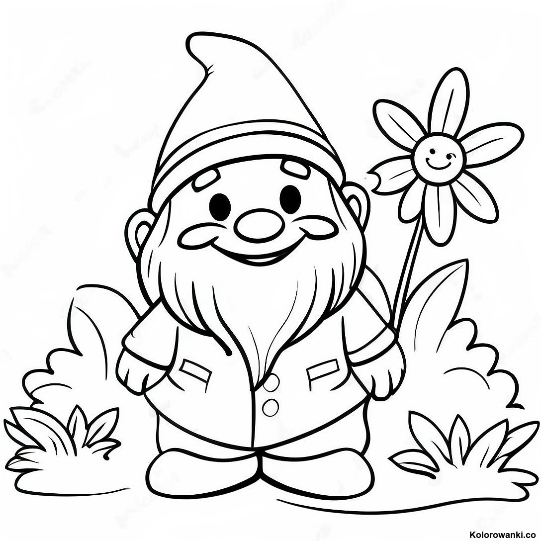 Pobierz Drukowalny PDF Szczęśliwy Ogrodowy Krasnal Z Kwiatami